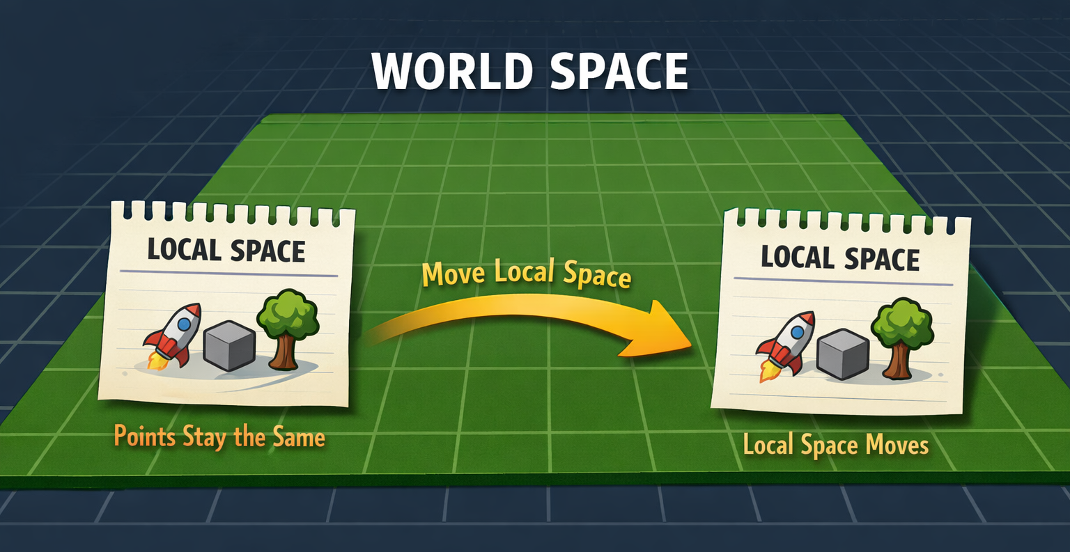 이러한 개념을 통해 한 가지 중요한 사실을 알 수 있습니다. 물체를 월드 공간으로 배치하는 과정은 물체를 구성하는 점을 월드 공간으로 이동시키는 것처럼 보이지만, 실제로는 월드 공간 위에 로컬 공간을 덮어 복사하는 방식입니다. 이는 마치 종이 위에 그림을 그려놓고, 그림 대신 종이를 움직이는 것처럼요.