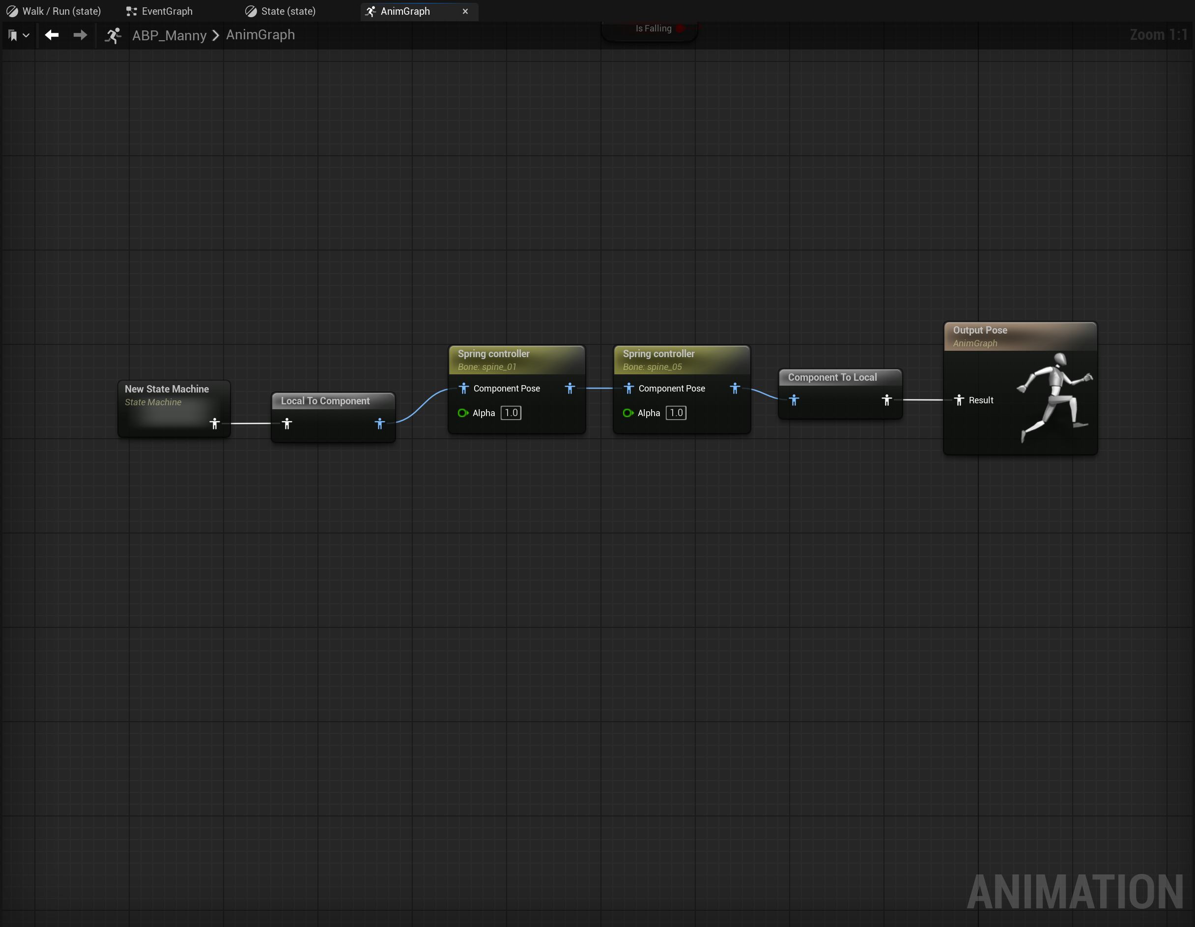 - Anim Graph๋ก ๋์์์ Output Pose ์ด์ ์ โSpring Controllerโ ๋ ธ๋๋ฅผ ์ถ๊ฐํฉ๋๋ค.