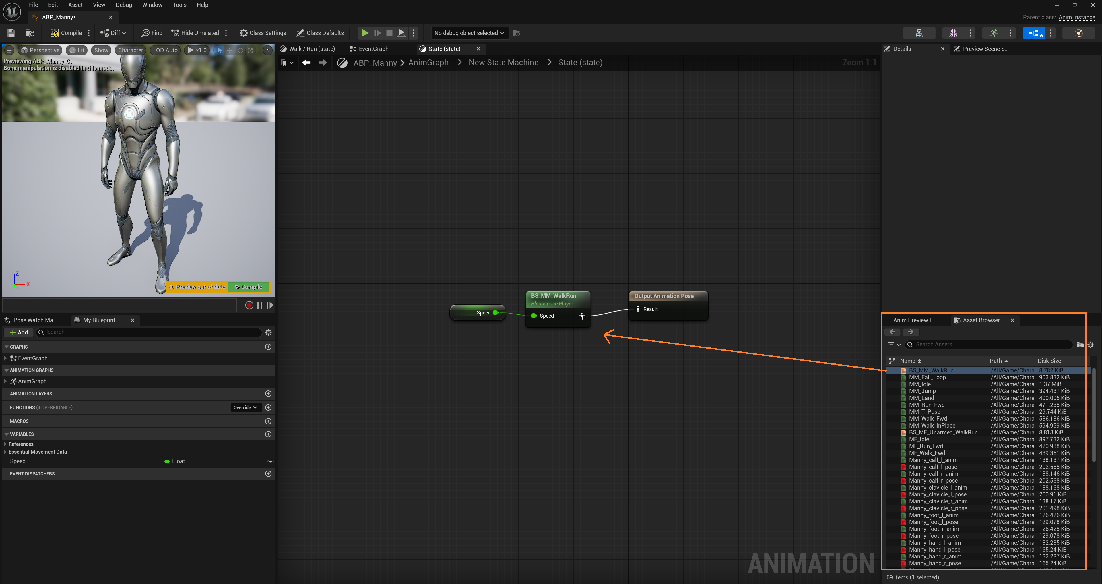 - ์์ฑ๋ State๋ฅผ ๋๋ธํด๋ฆญํ์ฌ ๋ด๋ถ๋ก ์ง์ ํ ํ, ์ ๋๋ฉ์ด์ ์ ๊ทธ๋ํ๋ก ๋ถ๋ฌ์ Output Animation Pose ์ฐ๊ฒฐํฉ๋๋ค.