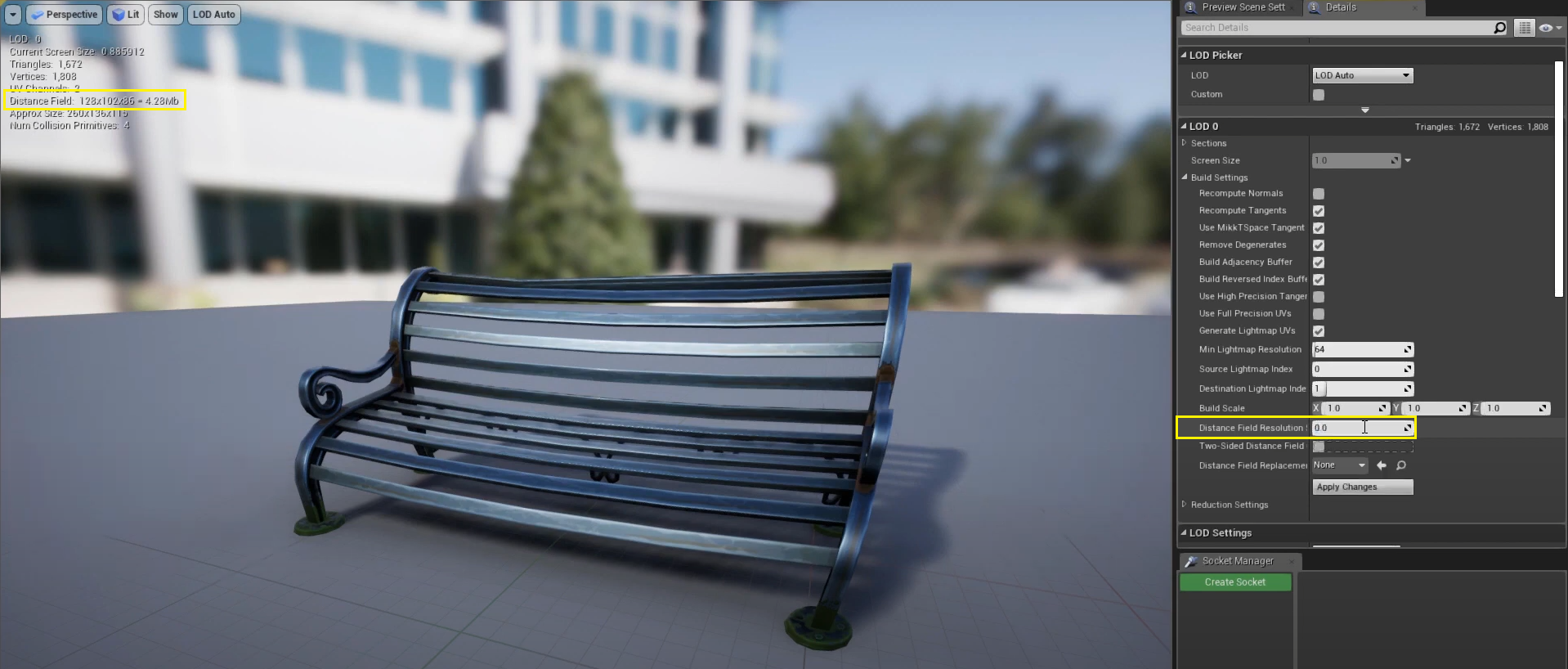 - Static Mesh ์๋ํฐ์์ โDistance Field Resolution Scaleโ ๊ฐ์ ์กฐ์ ํ์ฌ ํด์๋๋ฅผ ๋ณ๊ฒฝํ ์ ์์ต๋๋ค