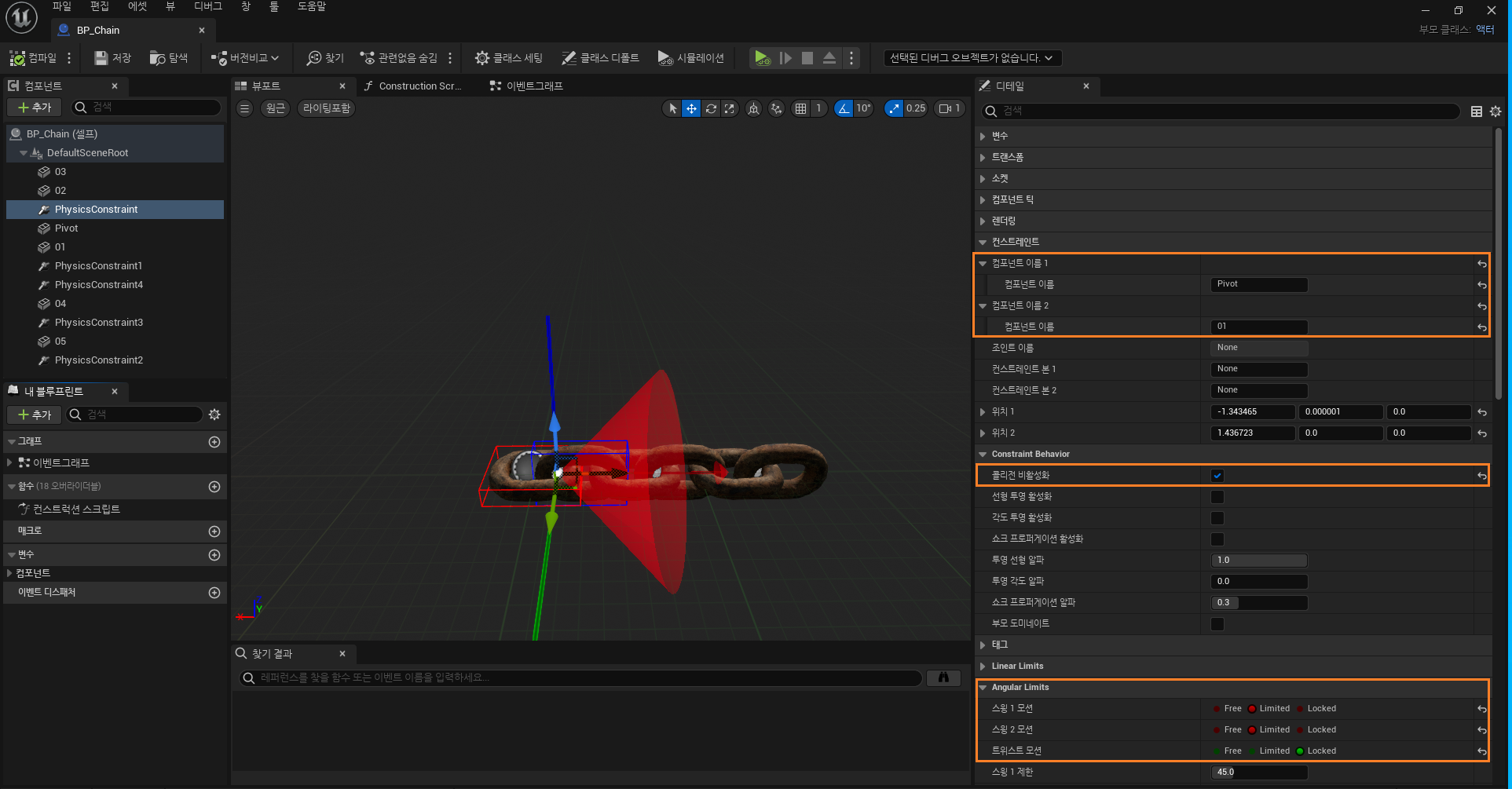 Physics Constraint Actor^[๋ ๊ฐ์ Rigid Body ์ฌ์ด์ ์๋์ ์ธ ์ด๋(Translation)๊ณผ ํ์ (Rotation)์ ์ ํํ๋ ๋ฌผ๋ฆฌ์ ์ ์ฝ ์กฐ๊ฑด]๋ ๋ ๊ฐ์ ์ค๋ธ์ ํธ๋ฅผ ์ฐ๊ฒฐํ๋ ๊ด์ ์ญํ ์ ํฉ๋๋ค. ์ฌ๋ฐ๋ฅธ ์ค์ ์ ํตํด ์์ฐ์ค๋ฌ์ด ์ฒด์ธ ์์ง์์ ๊ตฌํํ ์ ์์ต๋๋ค.