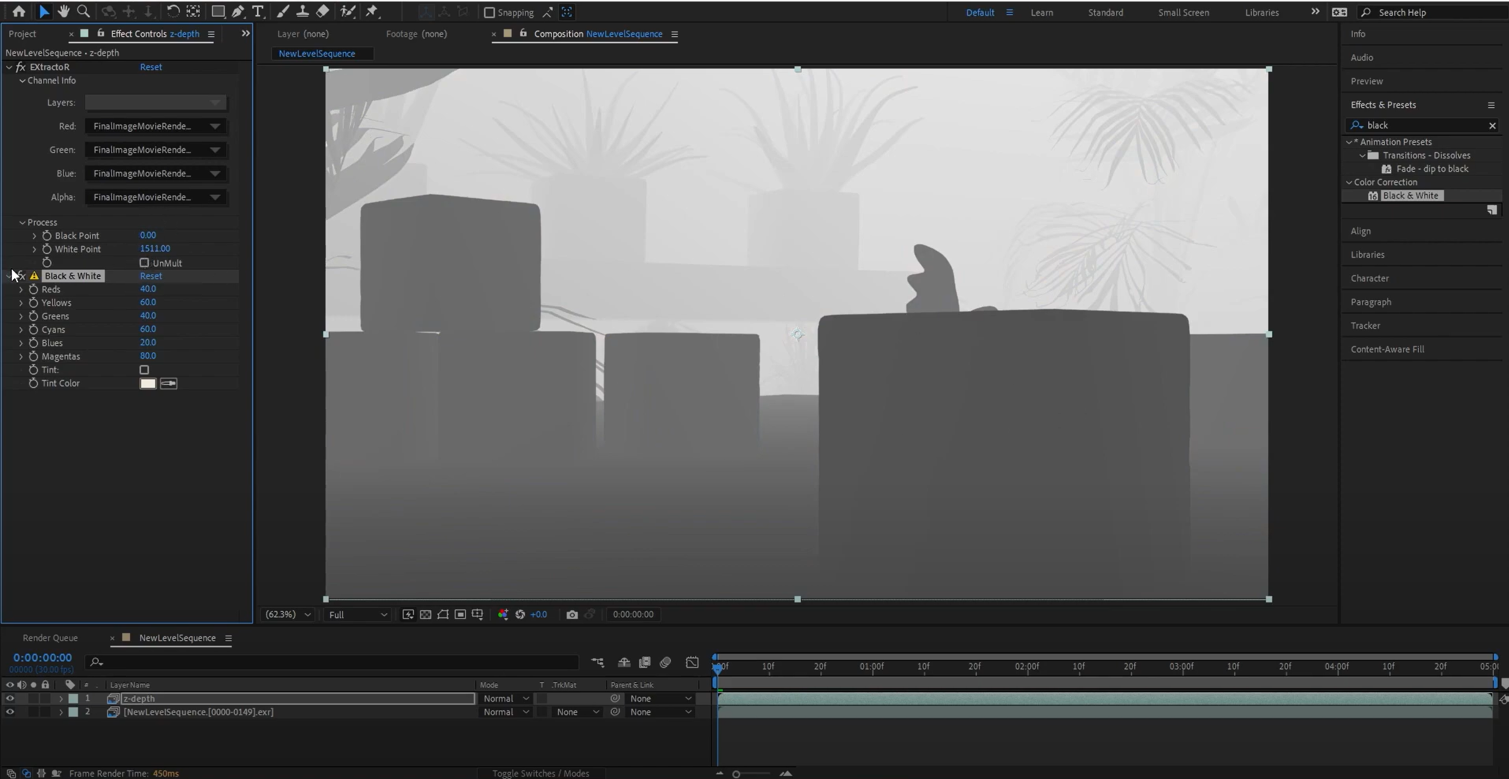 1๏ธโฃ ๋ ์ด์ด ํจ๋์์ ๋ ๋๋ง๋ ๊น์ด ํจ์ค๋ฅผ ์ ํํฉ๋๋ค. 2๏ธโฃ Black Point์ White Point ๊ฐ์ ์กฐ์ ํ์ฌ ๊น์ด๊ฐ์ ๋ฒ์๋ฅผ ์ค์ ํฉ๋๋ค.