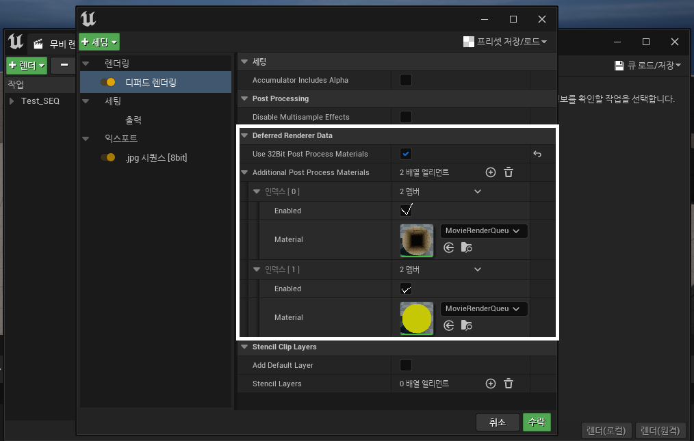 Movie Render Queue โ Deferred Rendering ์น์ ์์ Additional Post Process Material ์ฌ๋กฏ์ ์ถ๊ฐํด์ ํ์ํ ๋ชจ๋ ํฌ์คํธ ํ๋ก์ธ์ค ๋จธํฐ๋ฆฌ์ผ์ ์ฐจ๋ก๋๋ก ์ค์ ํฉ๋๋ค.
