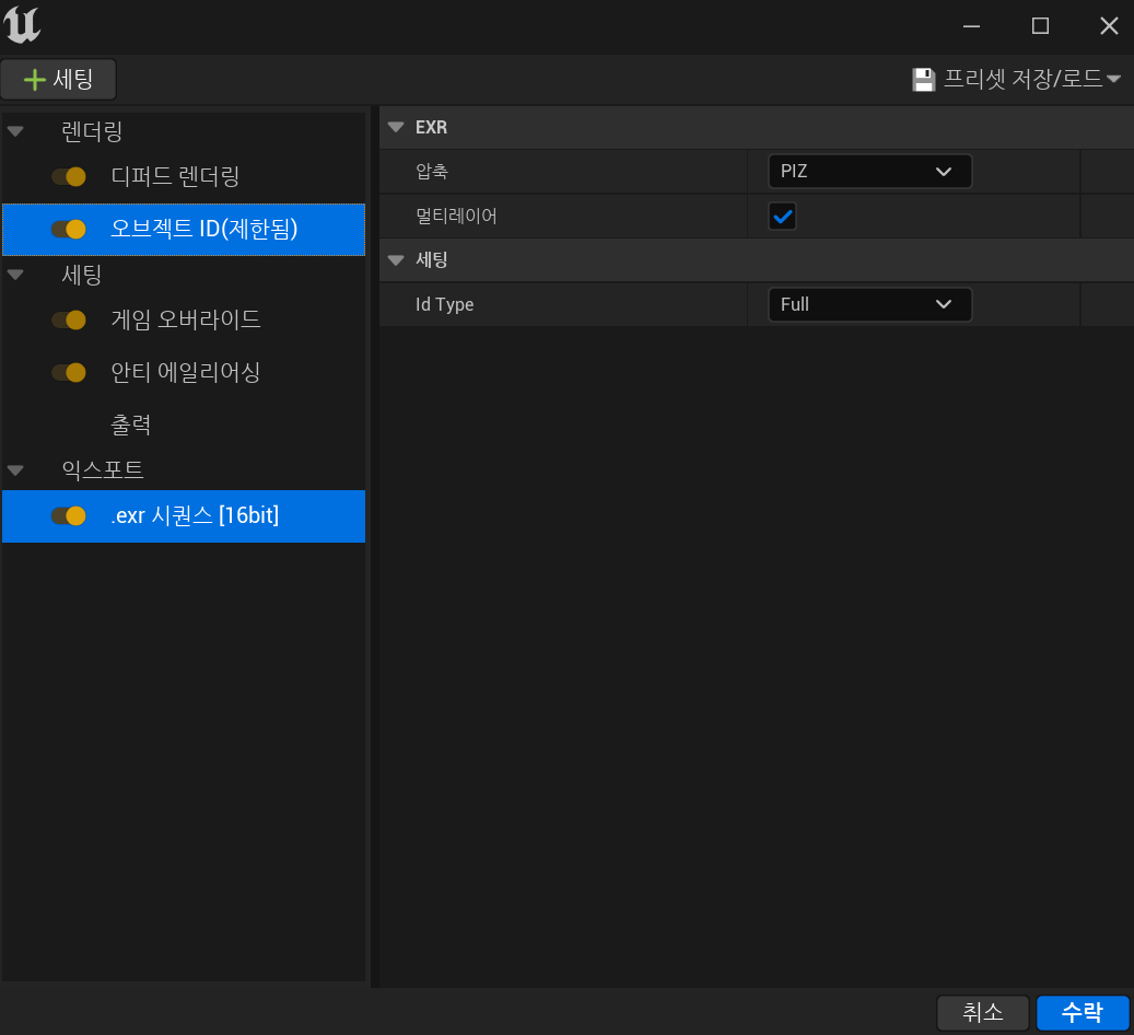 Output Format ํ์ผ ํ์: EXR ์์ถ: PIZ ์ด์