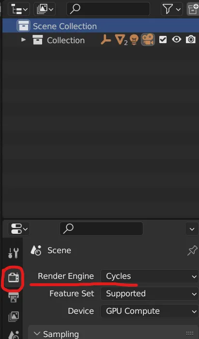 - Render Properties์์ย Render Engine์ โCyclesโ๋ก ์ค์ ํฉ๋๋ค.