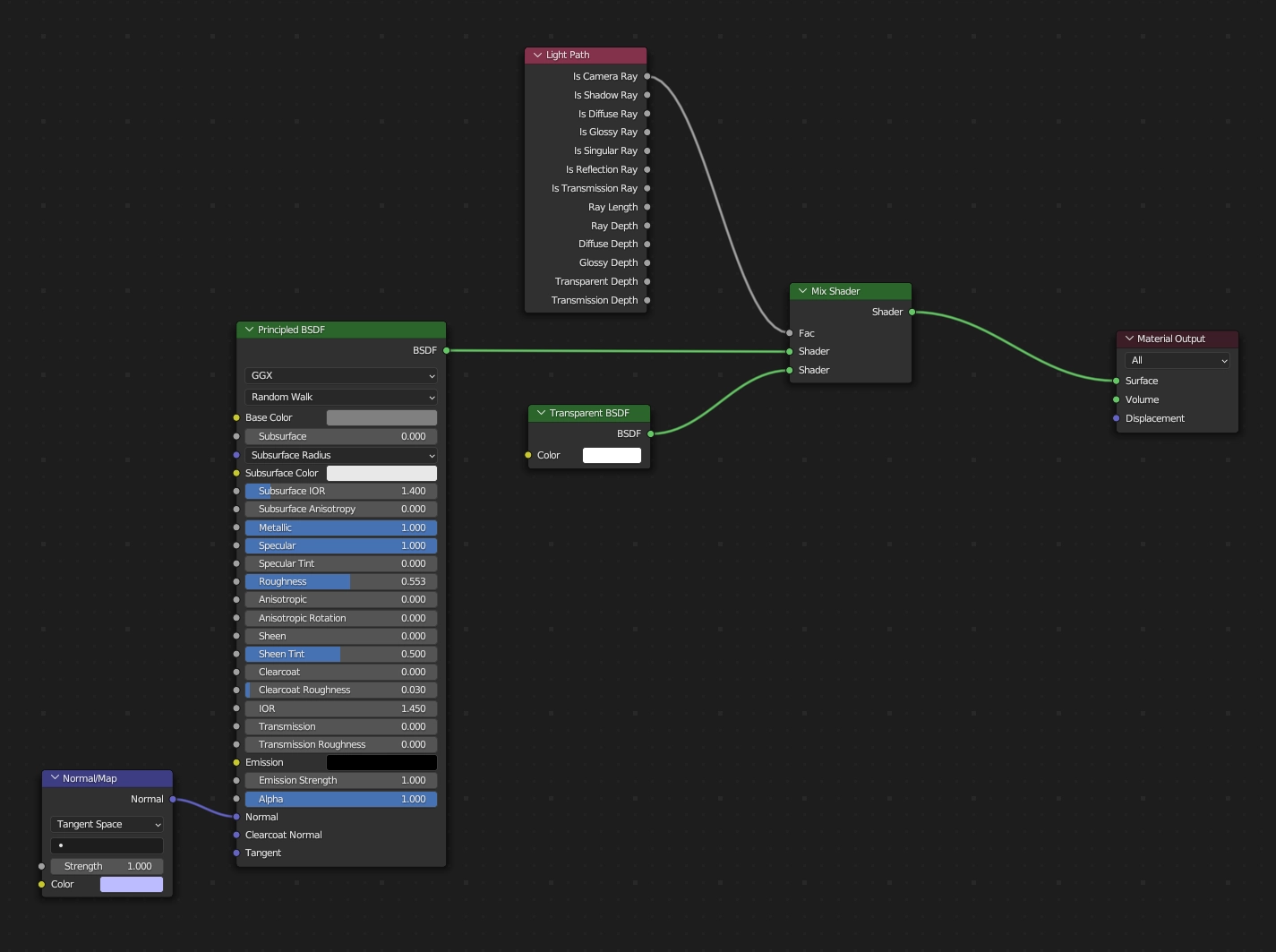 - Is Camera Ray๊ฐ False(0)์ผ ๋: Principled BSDF ์ฌ์ฉ โ ๊ทธ๋ฆผ์ ์์ฑ