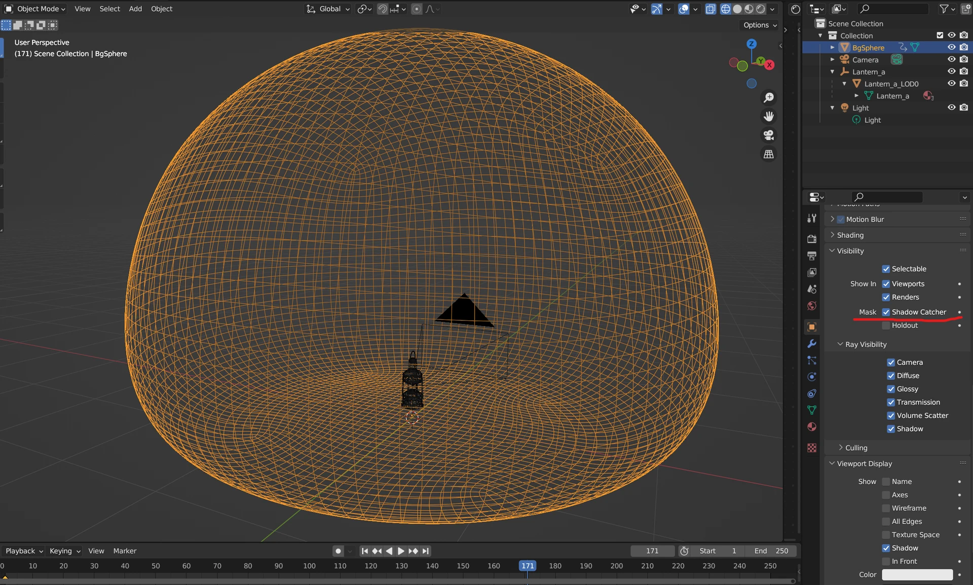 BGSphere ์ค๋ธ์ ํธ๋ฅผ ์ ํํฉ๋๋ค Object Properties โ Visibility โ Ray Visibility์์ย Shadow Catcher๋ฅผ ํ์ฑํํฉ๋๋ค
