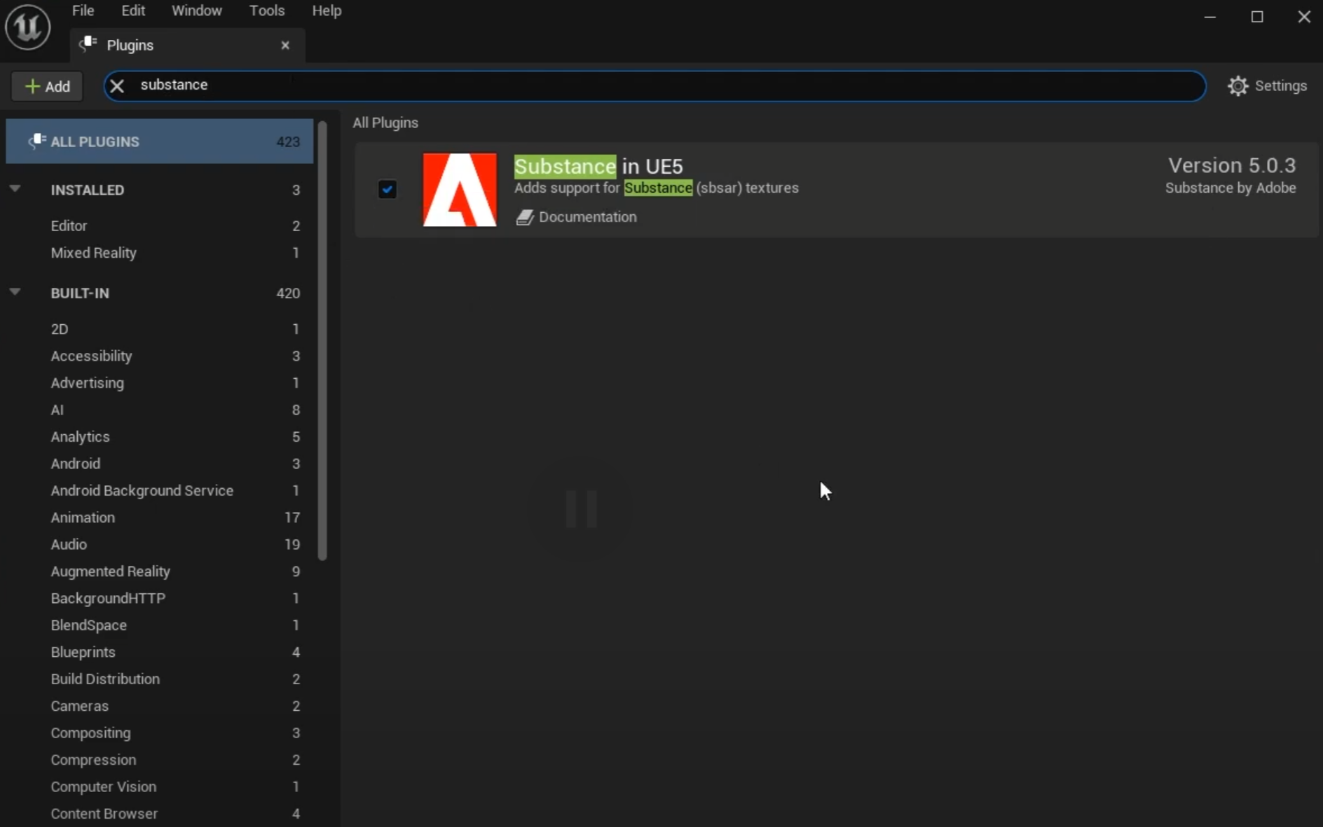 Plugins μ°½μμ Substance in UE5 νμ±ννκ³ μμ§μ μ¬μμν©λλ€.